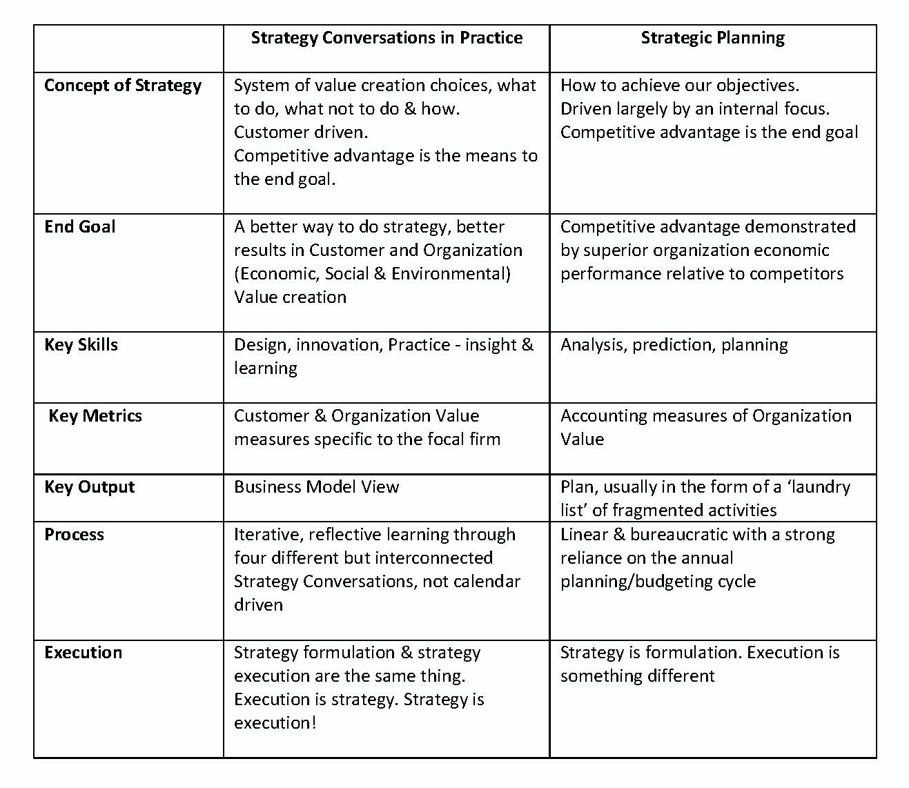 Strategy Conversations ARE continuous dialogue on the choices an organization makes or might make to create Customer Value and to share in that value. Strategy Conversations may be formal or informal, one on one or in small groups (no more than 6 to 8 so no one can hide) with hierarchies parked at the door (so no one can hijack the discussion), short or long term in orientation, within or between organizational levels or functions and may involve both insiders and outsiders to the firm.