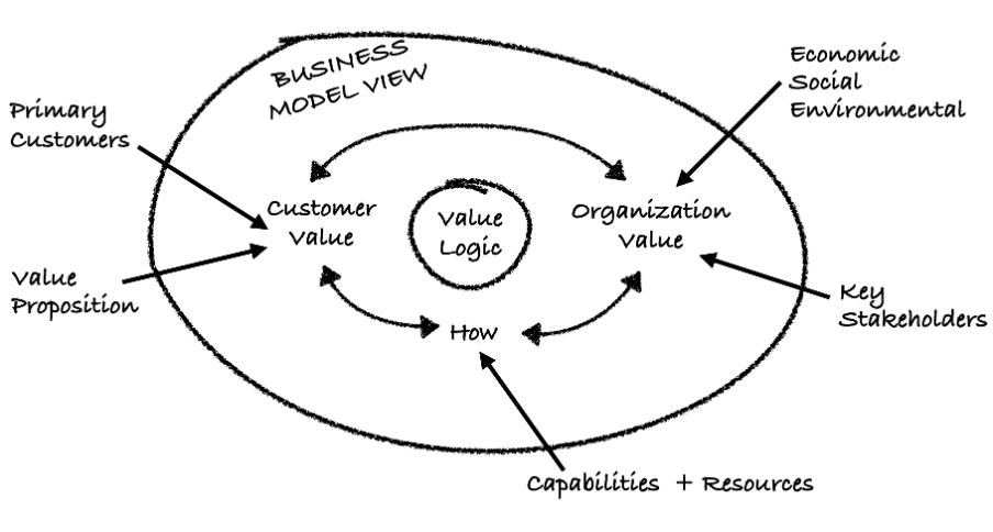 The Table shown previously oversimplifies the process through which these choices are made. The progression from Customer Value to Organization Value to the Capabilities + Resources System is not linear and nor is it a simple process. Rather, it’s a design process that is better represented by the Business Model View in the figure below. This View demonstrates a holistic pattern of interdependent Value Creation choices that must be considered simultaneously and iteratively.