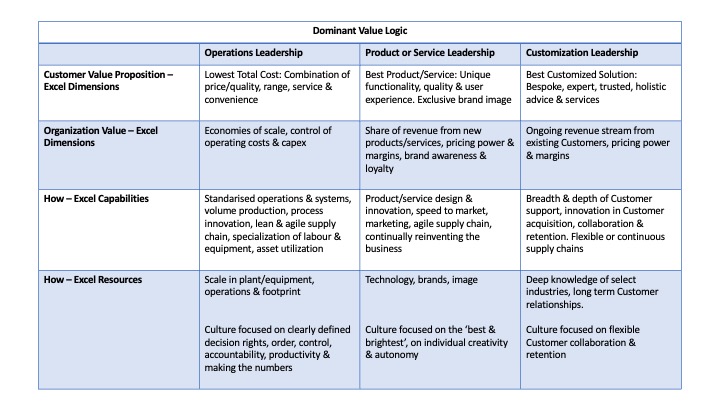 The relationship between generic ‘Excel’ dimensions of Customer and Organization Value and ‘Excel’ Capabilities and Resources is summarized in the table below.