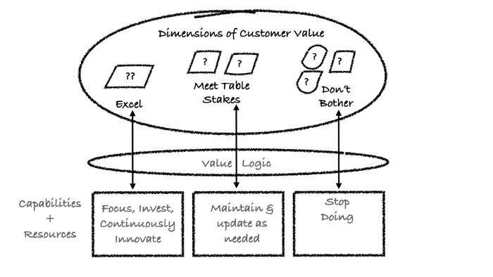 – How: Are we focused on, investing in and continuously improving the Capabilities and Resources needed to deliver the ‘excel’ value dimensions? Are we maintaining the Capabilities and Resources needed to deliver Table Stakes value dimensions. Are we wasting investment, time and effort in areas that don’t matter?